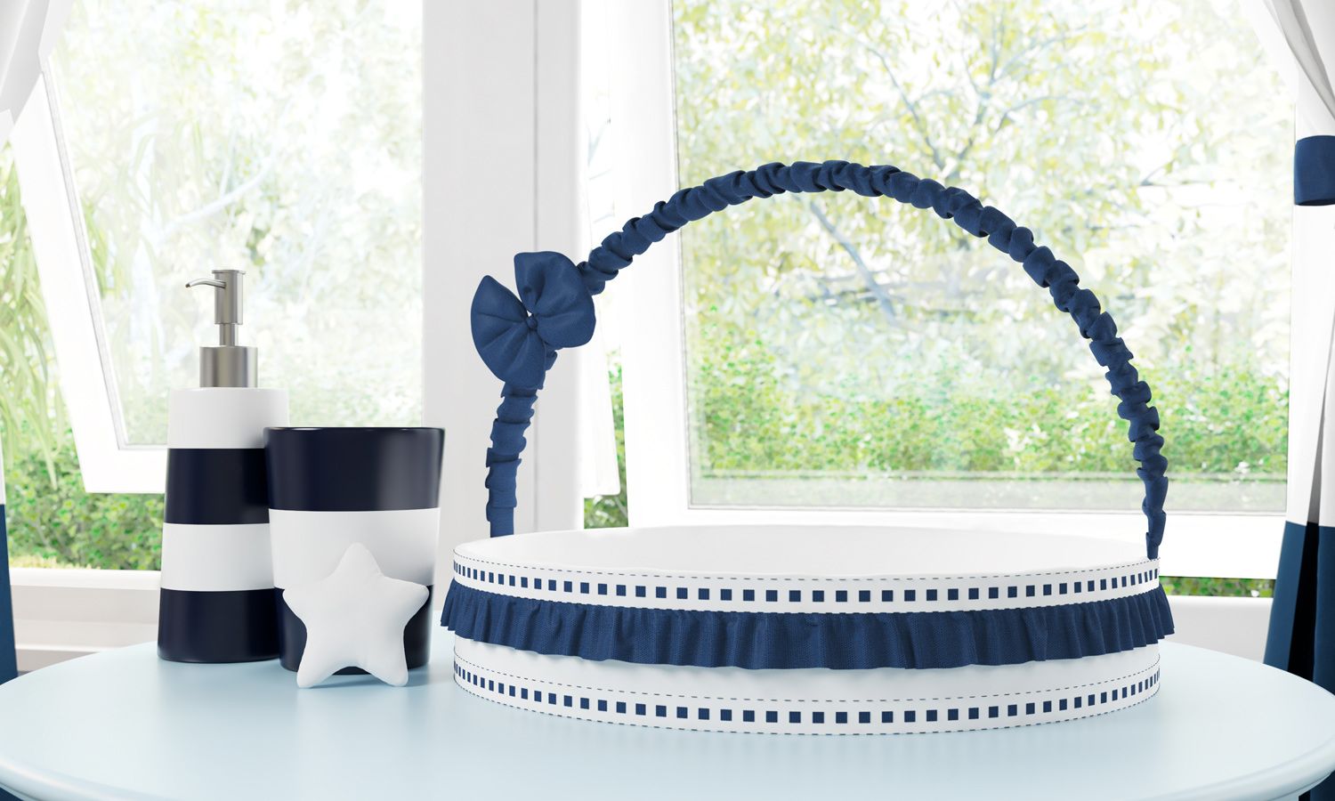 Um cantinho sofisticado pede detalhes elegantes e caprichados, como a Cesta da Coleção Urso Aviador! Adorado pelas mamães, o acessório auxilia na hora de trocar a fraldinha e facilita a rotina de cuidados do neném, mantendo os produtinhos importantes sempre por perto. Com um design refinado e delicado, ele armazena pomadas, lencinhos, medicamentos, potes e até moringas, acrescentando uma porção extra de estilo à decoração do quarto de bebê. Esse modelo exclusivo arranca suspiros graças aos babadinhos, drapeado, detalhe de passa-fita e um gracioso lacinho, tudo confeccionado num tom elegante de azul.
