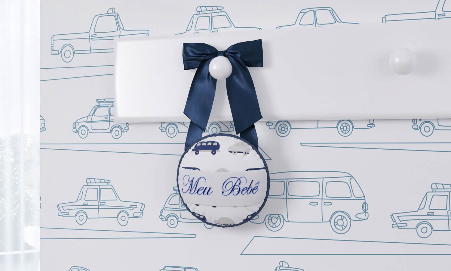 Pronto para receber o novo menino da família, o Medalhão de Porta Carrinhos já anuncia o charme do quarto de bebê com o belíssimo bordado de “meu bebê”! A peça traz uma macia almofadinha para coroar a decoração do cantinho e convidar família, amigos e visitas para entrar no universo do seu amor. Exclusivo, esse modelo arranca suspiros das mamães com uma sofisticada estampa, que esbanja bom gosto e personalidade — belíssimos automóveis que variam entre bege e tons de azul. Para pendurá-lo, o acessório conta com um formoso laço de cetim azul-bebê.